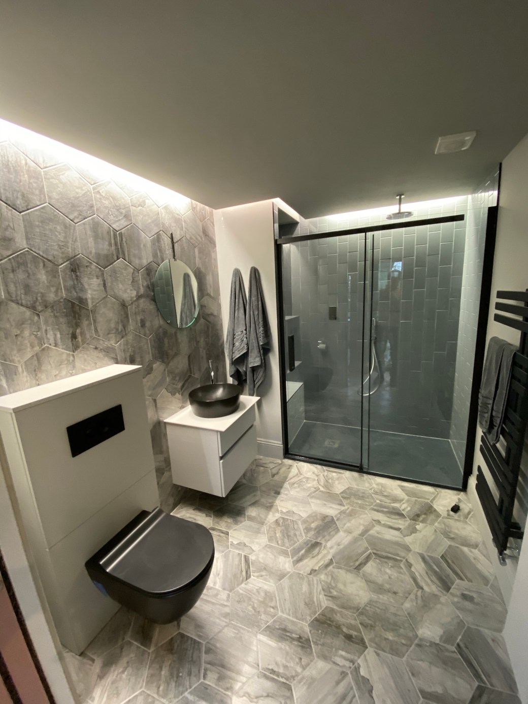 We work with customers closely, to help create the spaces they dream of. Custom electric heated mirror, digital shower processor, underfloor heatings and recessed lighting. This bathroom certainly looks unique!